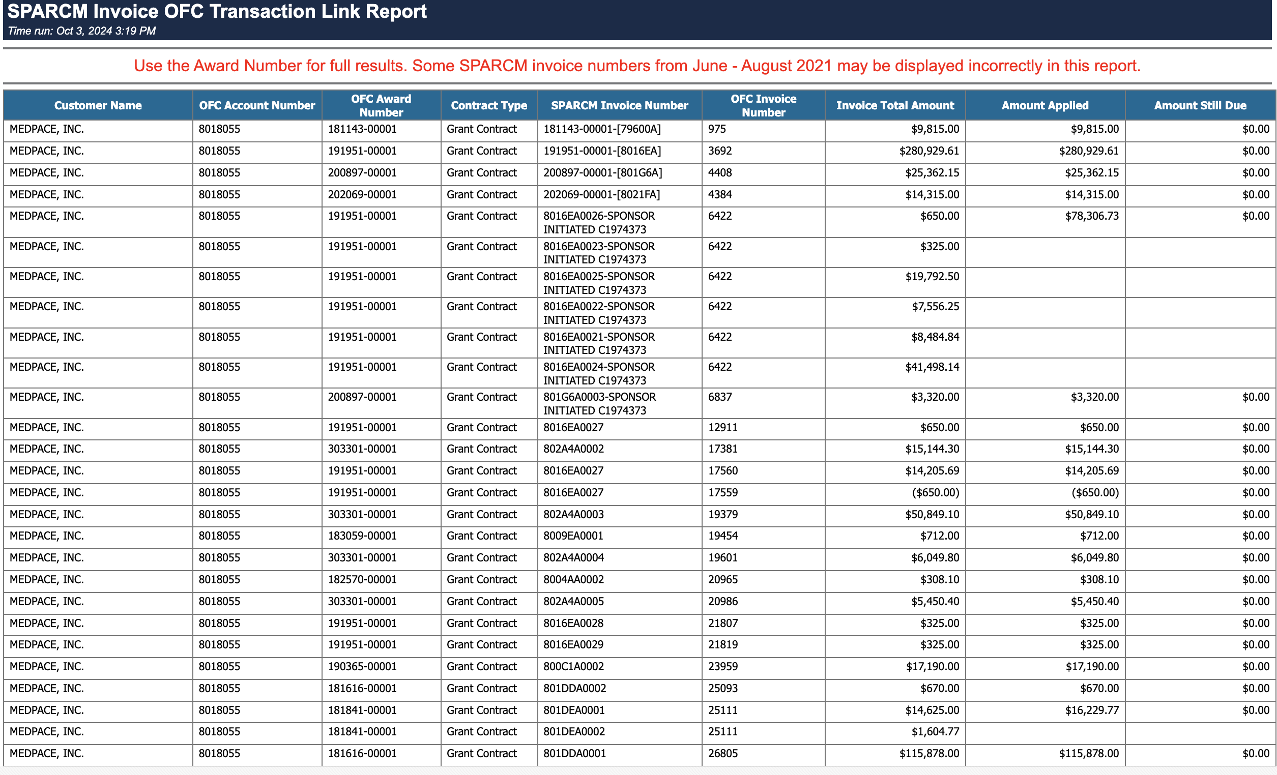 SPARCM Invoice OFC Transaction Link Report