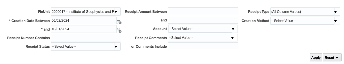 - To search for unclaimed receipts, select Unapplied and Unidentified from the Receipt Status dropdown.