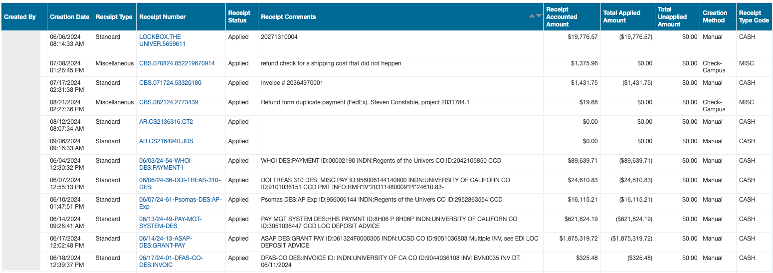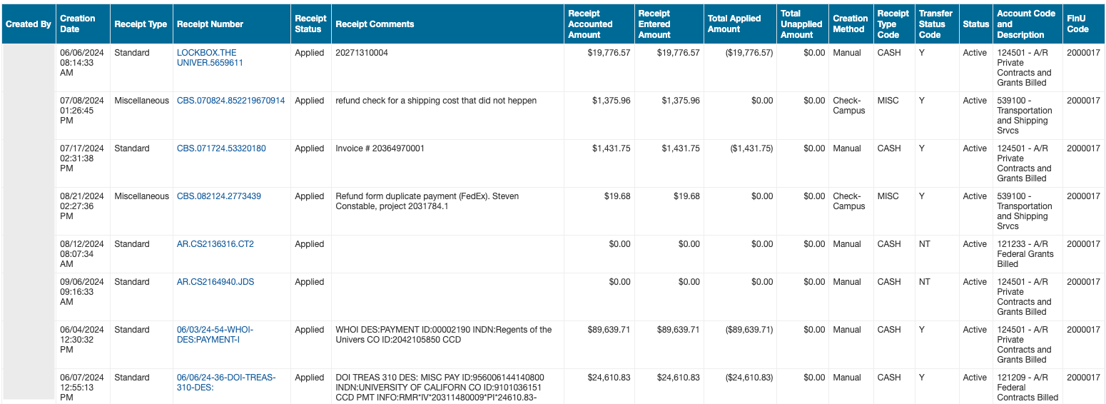 - Find recent payments for your financial unit by selecting Applied from the Receipt Status dropdown.