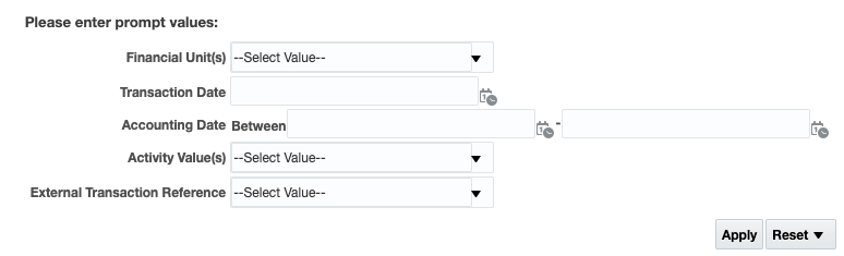 - The required filters are Business Unit and Accounting Date.