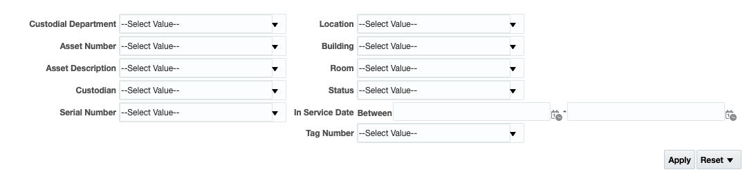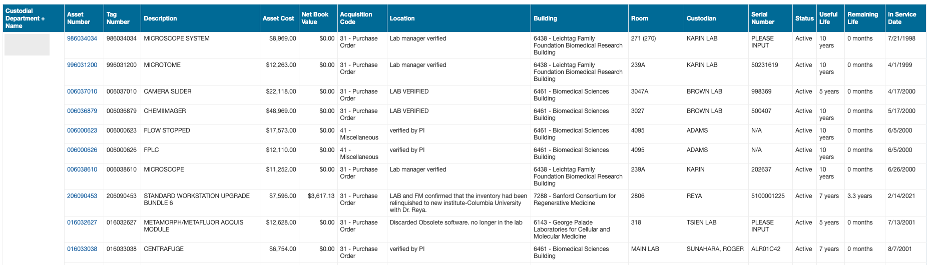 - Identify all assets held by a certain department, custodian or within a certain building.