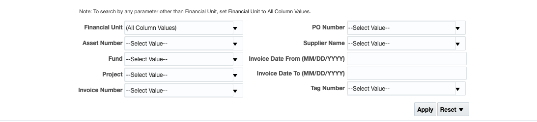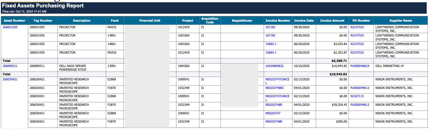 The Asset Purchasing report provides a comprehensive view of assets and their associated Invoices/POs. Use this report for: