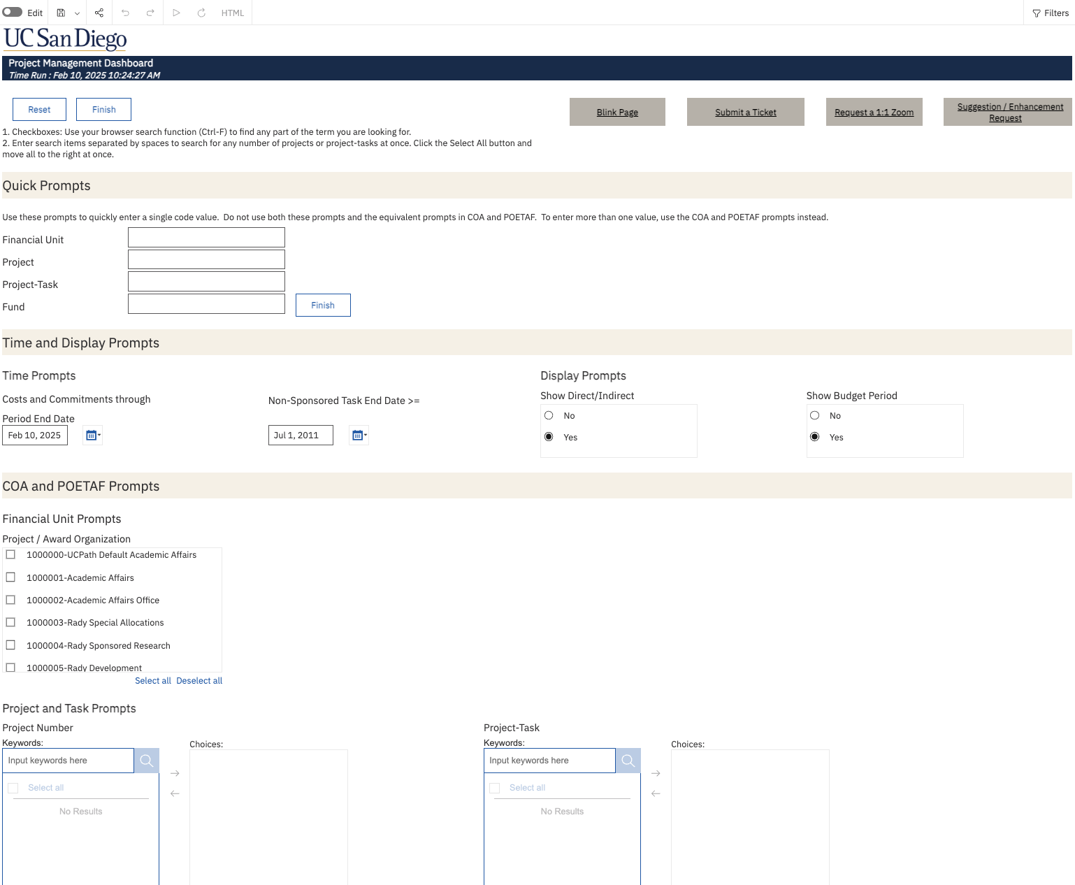 - Use the ‘Quick Prompts’ section to quickly enter a single value for Financial Unit, Project, Project-Task, and/or Fund.