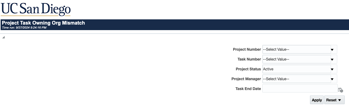 - Use this report to identify Projects or Tasks with wrong or potentially wrong owning organization.