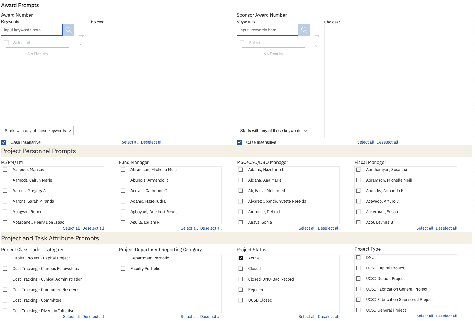 - Use the ‘Quick Prompts’ section to quickly enter a single value for Financial Unit, Project, Project-Task, and/or Fund.